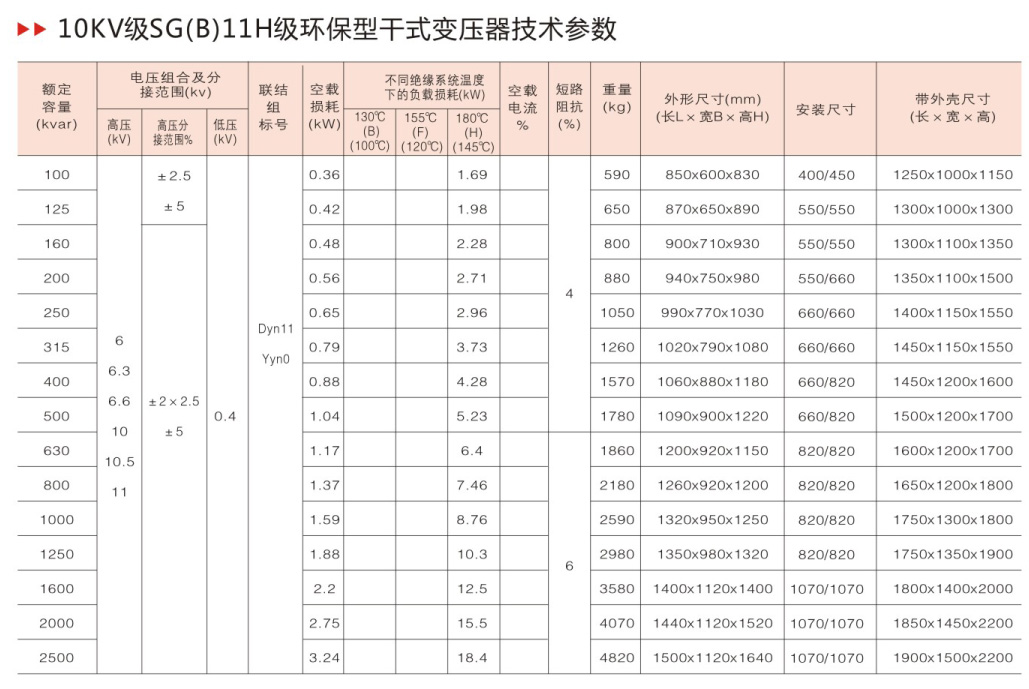 SG(B)11 型H 级绝缘干式电力变压器承受热冲击能力强,过负载能力大、难燃、防火性能高、低损耗、局部放电量小、噪声低、不产生有害气体、不污染环境、对湿度、灰尘不敏感、体积小、不开裂、维护简便因此,适宜用于防火要求高,负荷波动大以及污秽潮湿的恶劣环境中如:机场、发电厂、冶金作业、医院、高层建筑、购物中心、居民密集区以及石油化工、核电站、核潜艇等特殊环境中。